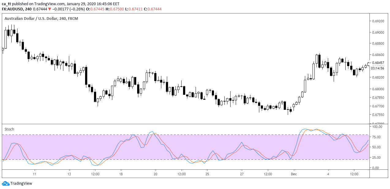 There is a 0 to 100 scale to the right of the indicator. When it drops down below 20, this indicates that the price is oversold and is ready for the upward reversal. When it rises above 80, this shows that the price is overbought and is likely to move downwards soon: