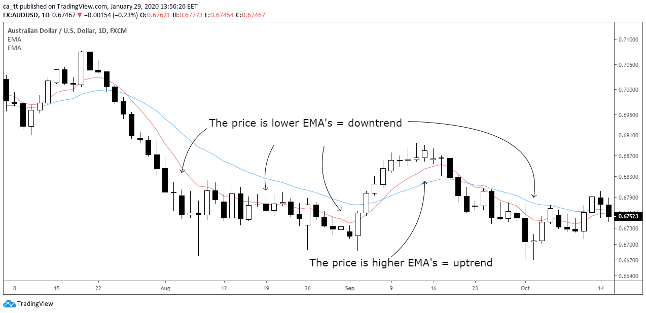 When the price is higher than EMA, there is an uptrend, when the price is lower, there is a downtrend.