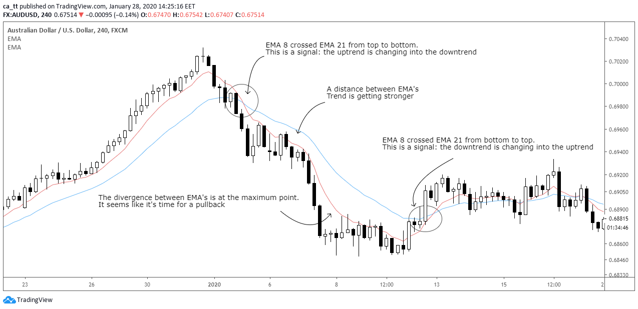 ЕМА 8/21 demonstrate when the trend is reversing, when it is getting stronger or weaker