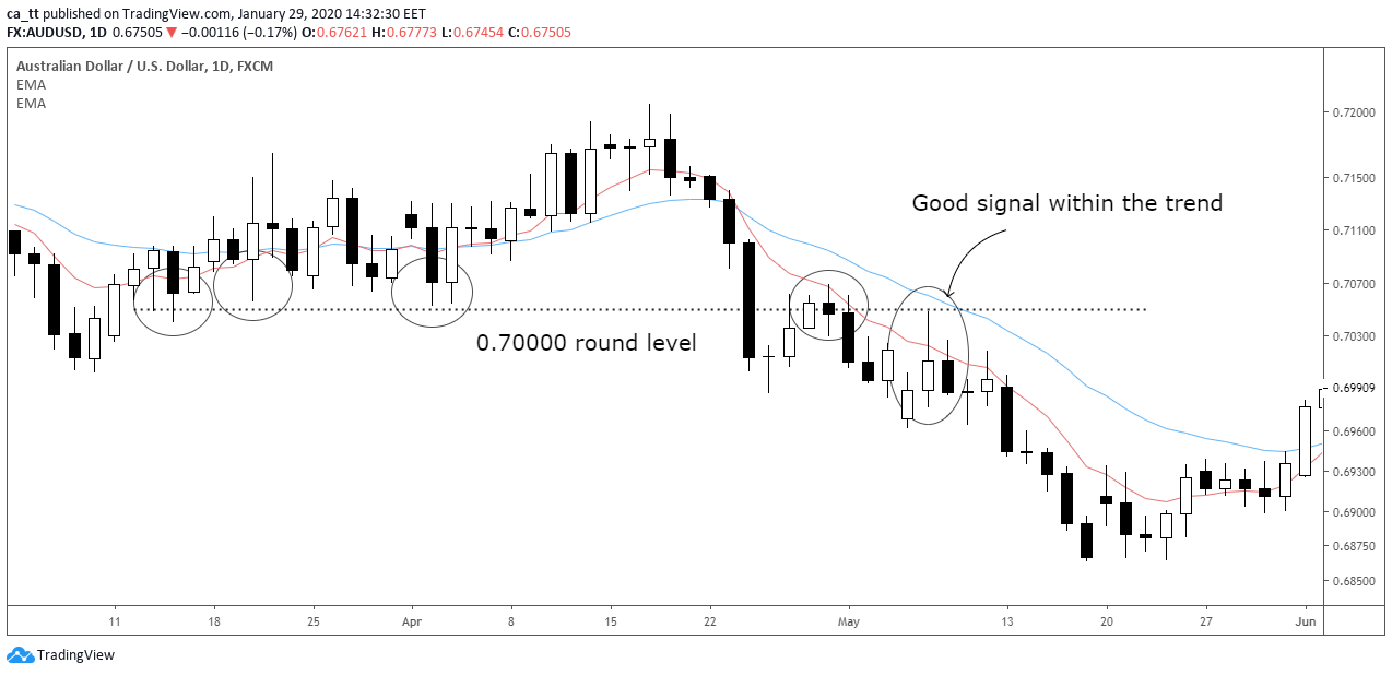 For the trend signals to be more accurate, traders place 2 moving averages in the chart with different time-frames: 8 and 21.