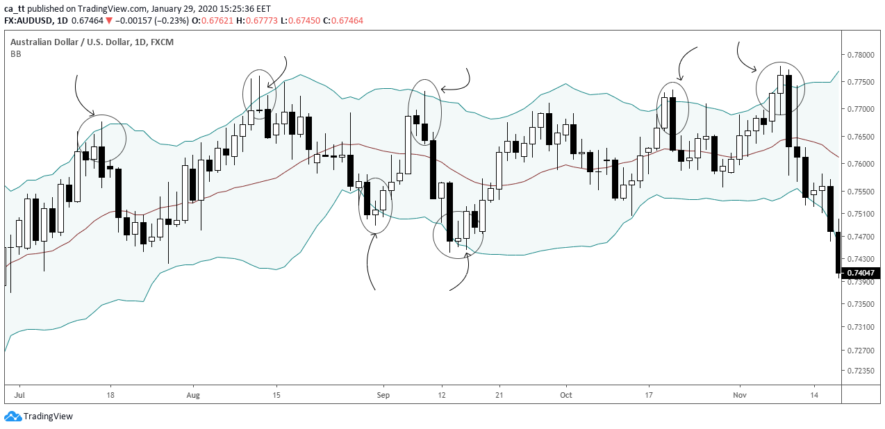 As you place the Bollinger bands on the chart, the price kind of gets surrounded by the indicator. Notice: everything beyond the bands is reversal points.