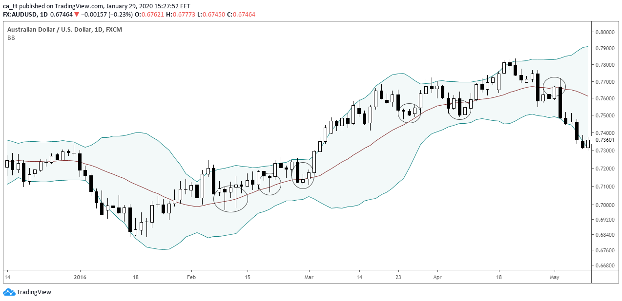 The third signal is that the price keeps crossing the middle Bollinger band.