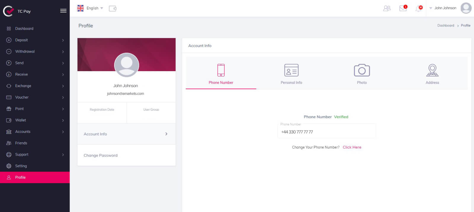 3. Profile. Go to the Profile tab, then select Phone Number. Ensure your full name, email address, and phone number are visible. The full name and phone number match the data, indicated in your AMarkets Personal Area. Take a screenshot and save it.