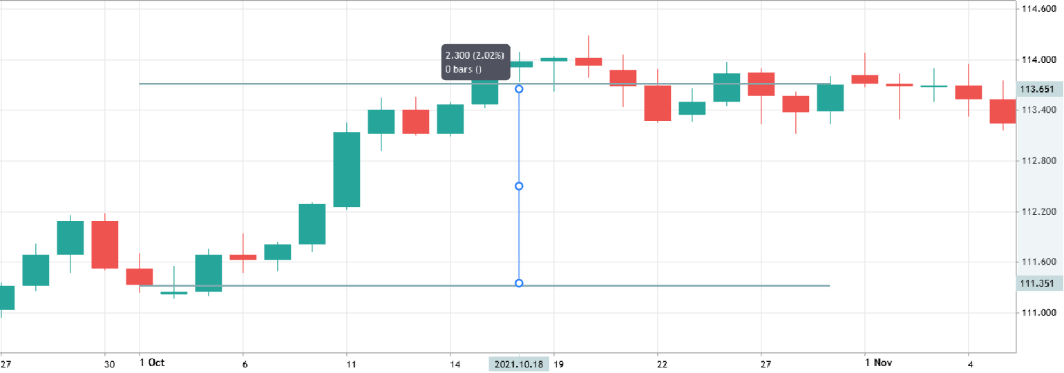 In 2021, October was indeed a positive month for USD/JPY, with a growth of about 2%. Notably, most of the gains occurred in the first two weeks, after which the pair consolidated below its peak, ending the month at that level.