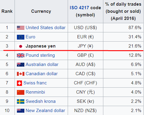 Yen (JPY) is a money unit of Japan and the world’s third currency in terms of turnover after US dollar and euro:
