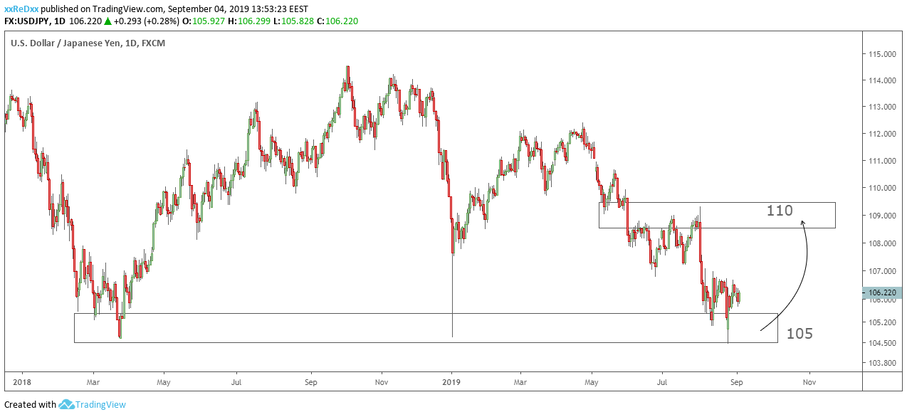 Traders bet that the demand area at a round-number level of 105 will constrain the price and that USD/JPY exchange rate will grow up to 110. Yen will drop, while dollar will grow: