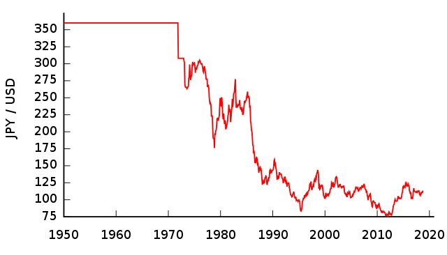 After the Second World War, Japanese economy was devastated. Due to the weak economy, yen depreciated and was undervalued. To restore the national currency exchange rate, the Central bank of Japan (known as just ‘the Bank of Japan’, or BoJ) established a fixed rate of Yen to USD in 1949: from thereon, ¥360 were paid for $1.