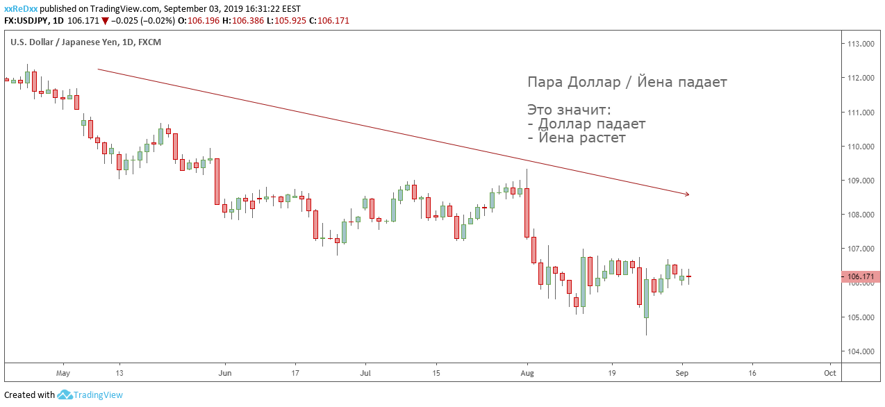In the chart below, USD/JPY goes down: dollar is reducing, yen is increasing: