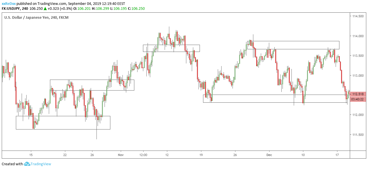 At the chart above, the demand areas can be seen below the chart and indicate the exchange rate where traders buy dollars and sell yen. The supply areas can be seen above the chart and indicate the exchange rate where traders sell dollars and buy yen.