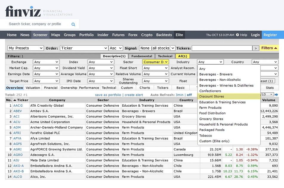 You can use screeners to sort stocks and find defensive ones. In the Finviz screener, for example, you can sort companies by sector and industry. For example, you can select discount stores: