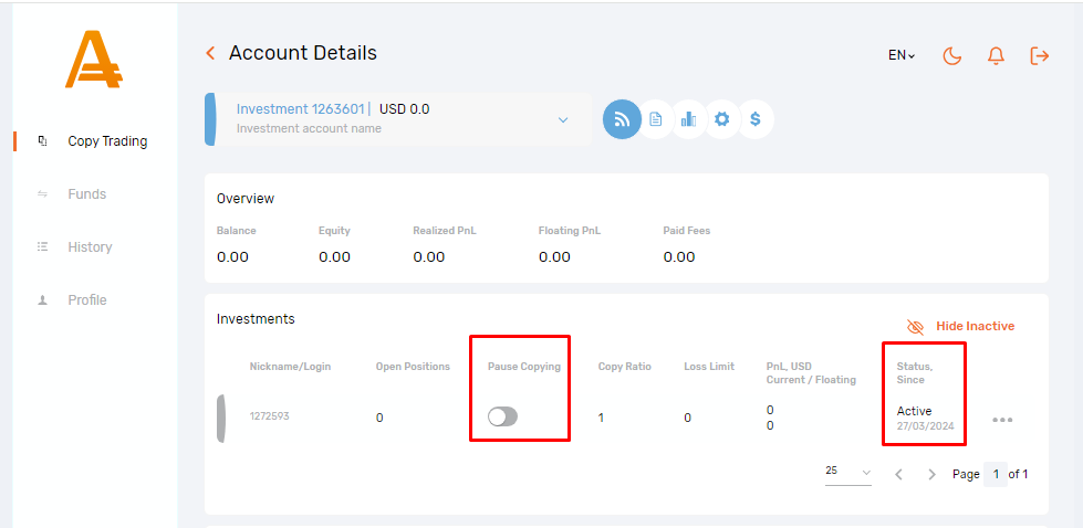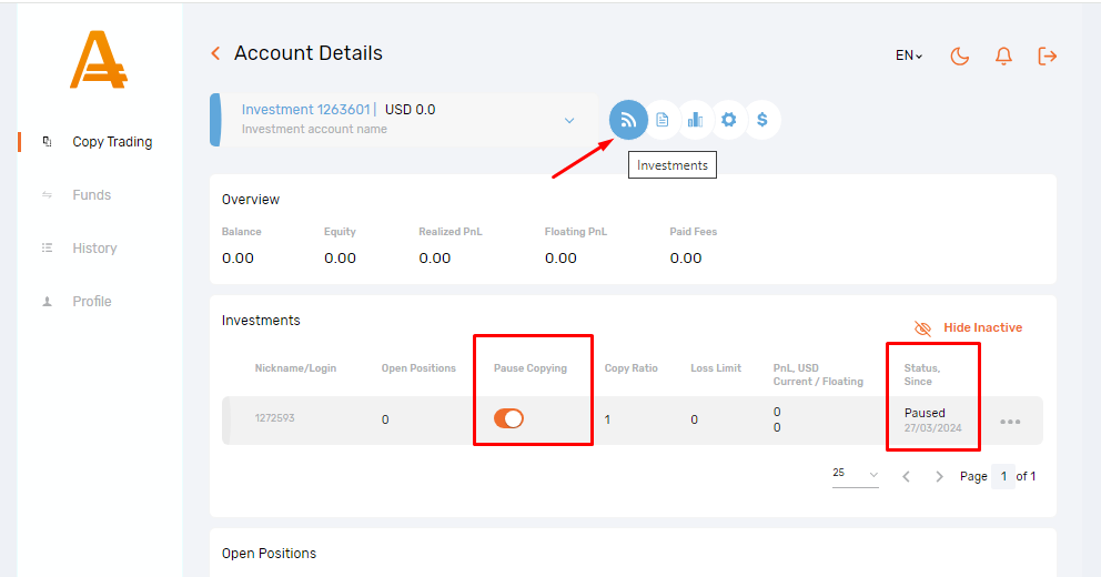 - New positions opened on the Strategy account won’t be copied to the Investment account.