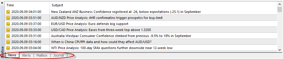 Like MetaTrader 4, MultiTerminal contains a Toolbox window with different tabs: news, alerts, mailbox, journal, etc. In order to view the information, select the appropriate tab in the toolbox window.