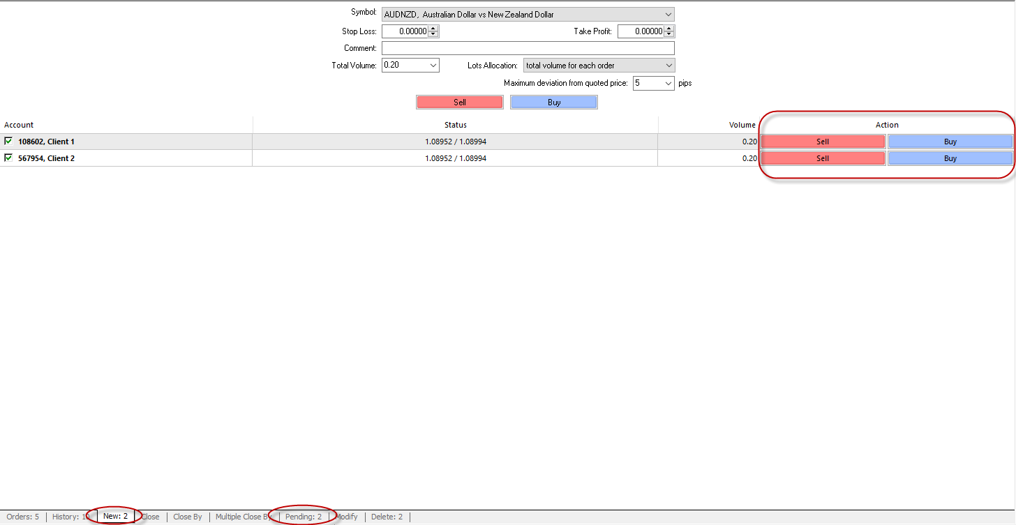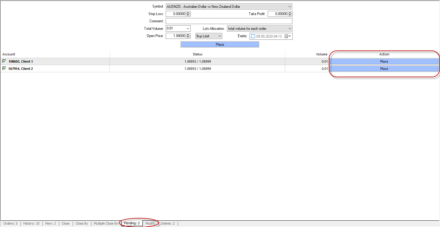 Pending orders can be placed using the “Pending” tab. Pending orders for all or some of the managed accounts can be placed in this tab. Every connected account is represented as a table line.