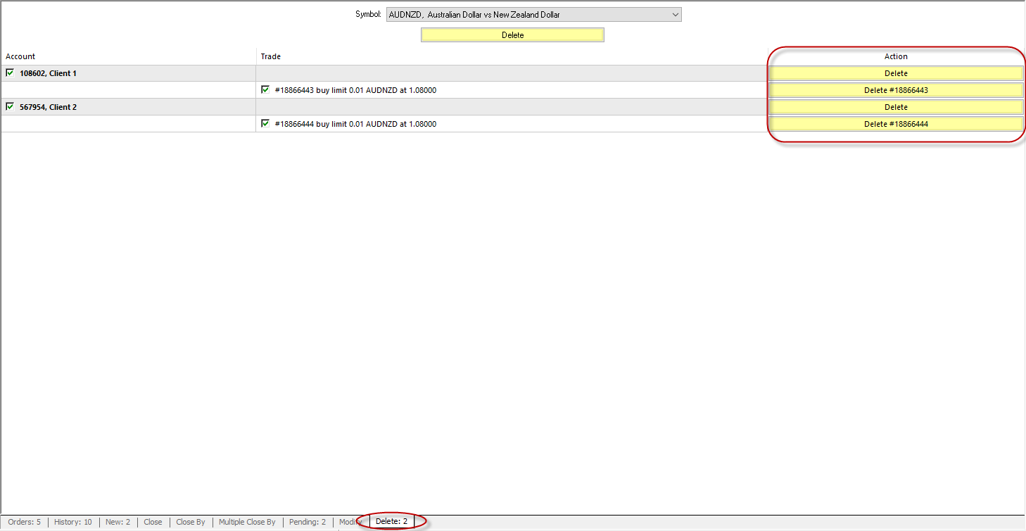 To delete a pending order, use the corresponding tab “Delete order”. In this tab, you can delete all or some orders for all or some of the managed accounts.