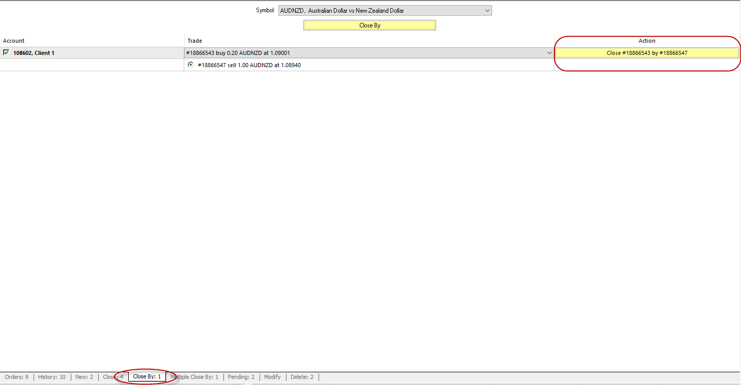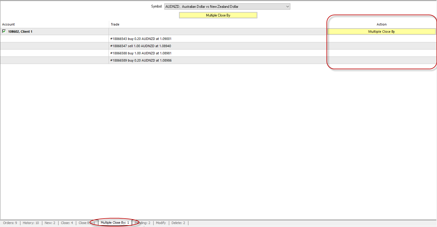 Multiple close of several counter positions allows simultaneous closing of more than two counter positions for one instrument. Several counter positions can be closed using the “Multiple Close By” tab. Counter positions for all or some of the managed accounts can be closed using this tab. Every connected account that has open counter positions and every open position are displayed in table lines. If there is no need to close positions for an account, this account line must be unchecked in the table. To close counter positions for a particular instrument, press “Multiple Close By” button.