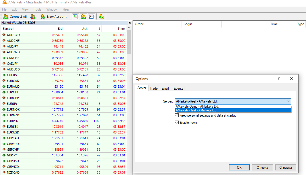 To get started, you need to connect MultiTerminal to the server – go to “Tools-Options” and select one of the available servers from the list in the “Server” tab.