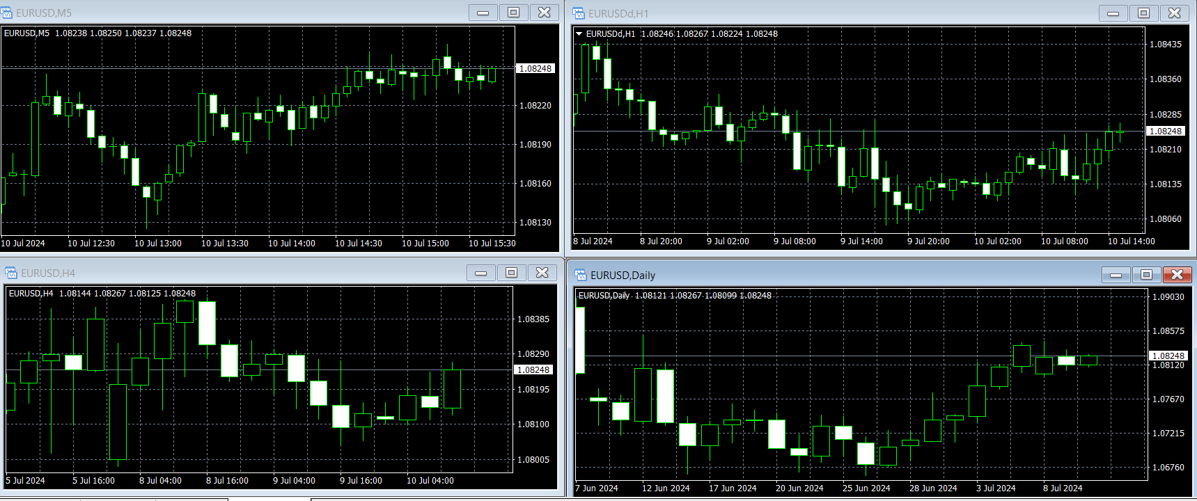 Many beginners are drawn to very short timeframes, like 1 minute to 15 minutes. This is because these charts seem to offer more signals and, therefore, more chances to make money. Unfortunately, it’s not that simple. Short-term charts can be misleading. To avoid this, multi-timeframe analysis comes in handy. Let’s look at some examples.