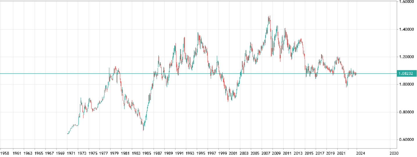 This concept is quite straightforward. The price of each instrument can be viewed on charts with different time intervals. These aren’t about chart types (candlestick, line, bar) but rather the time each candle represents. They can vary greatly, from 1 minute to 1 month. It stands to reason that charts on different timeframes will also look different, even though the current value of the asset remains unchanged. In our example below (Fig. 1 and Fig. 2), we have two charts of the EUR/USD pair on the monthly and minute timeframes, respectively.