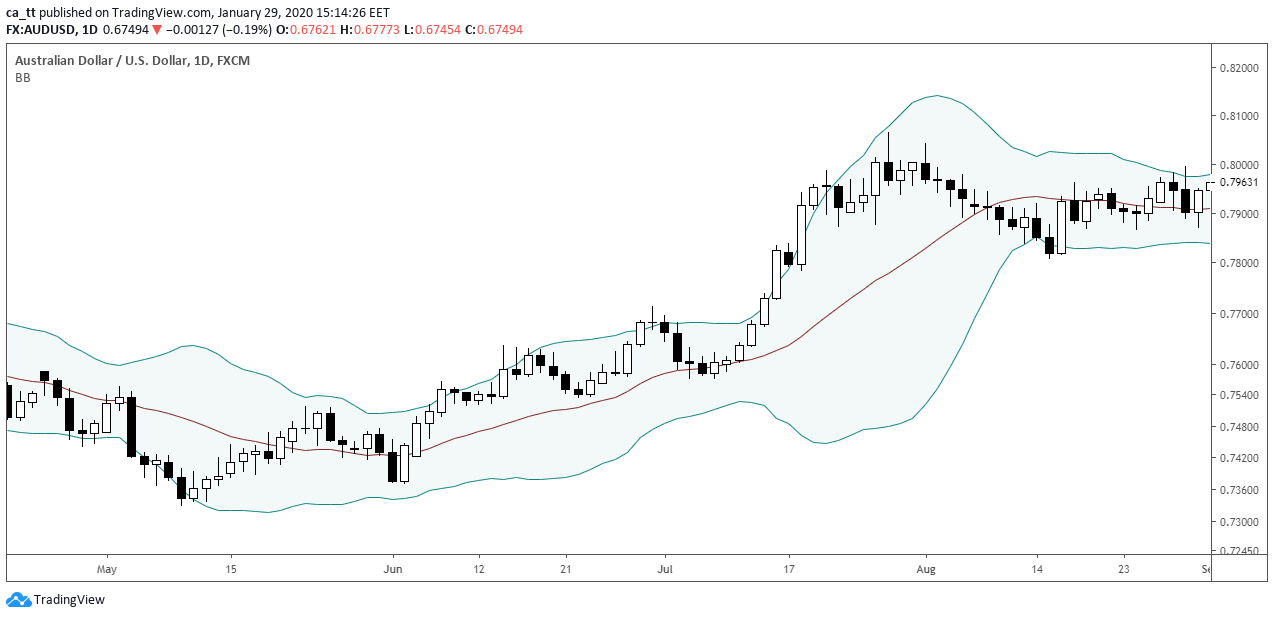 So, we now have a tool for trend trading, but what if we want to do the flat market trading? The simplest and the most reliable indicator for such a trade is Bollinger bands: