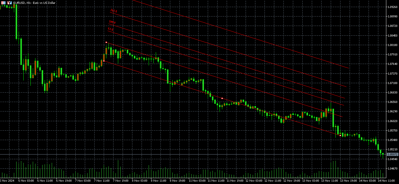 This tool is primarily used to determine correction levels. During a bearish trend, the rays are positioned above the chart, while in a bullish trend, they appear below.