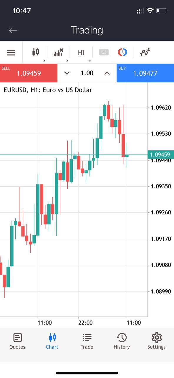For added convenience, you can enable the one-click trading option by tapping on the third icon from the right in the top toolbar. Using this panel you can instantly send buy or sell market orders with specified volumes.